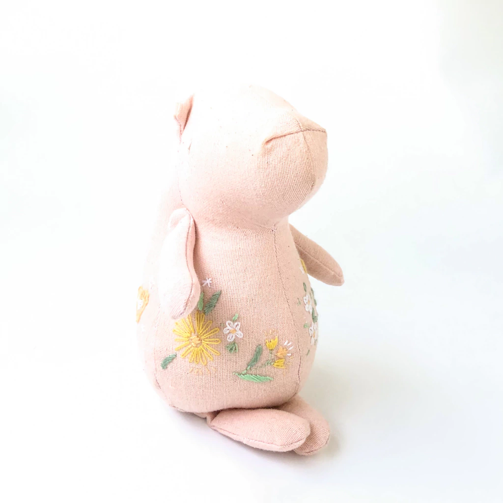 de algodón proveniente del descarte textil, bordada a mano con tiempo y paciencia. Cada bordado se dibuja a mano, por lo que cada pieza es única aunque sigue el patrón y diseño del original.