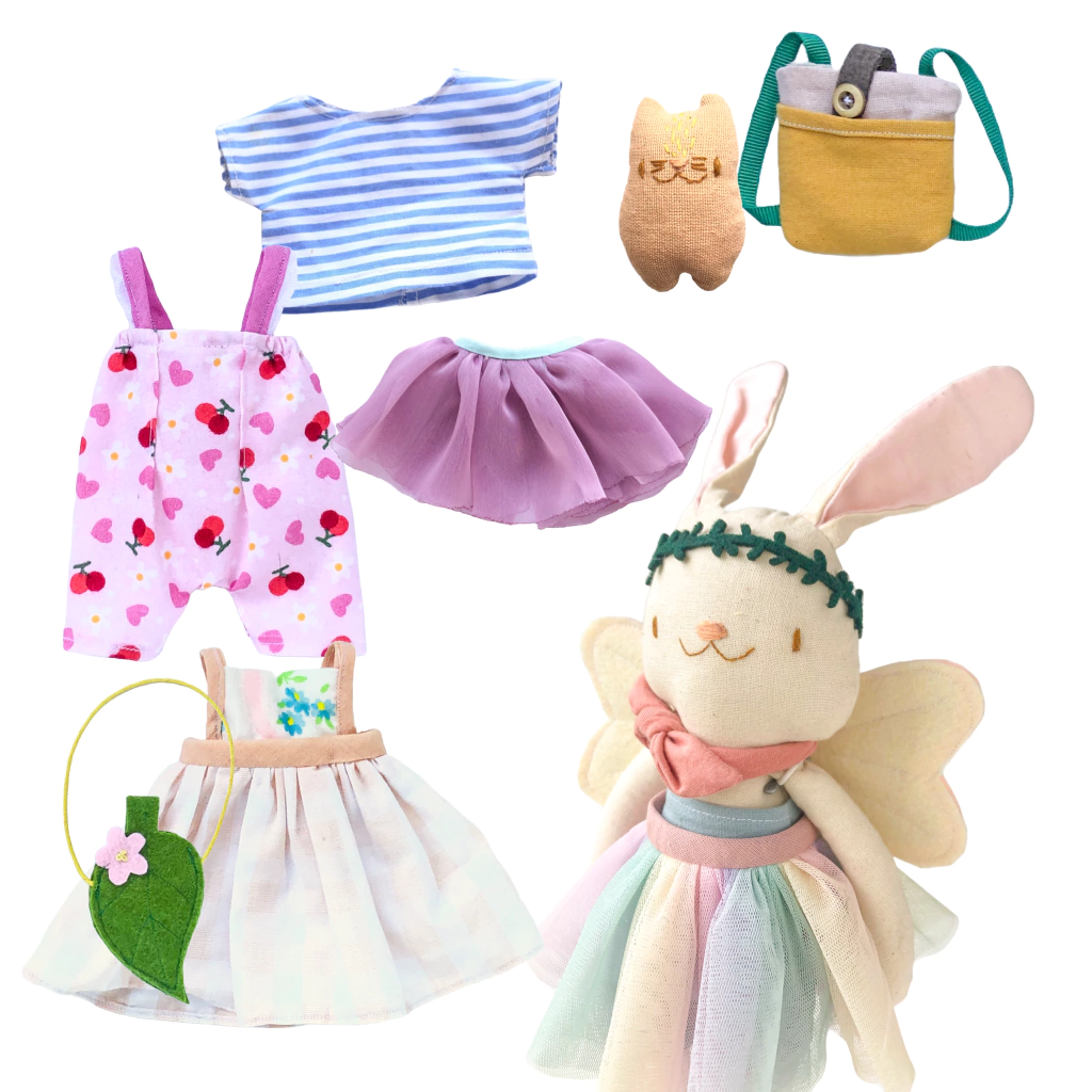 Este encantador set incluye una adorable muñeca de tela con forma de coneja, vestida como una hada mágica, perfecta para estimular la imaginación y el juego creativo. La muñeca viene con ropita intercambiable, permitiendo cambiar su look y agregarle diversión adicional.